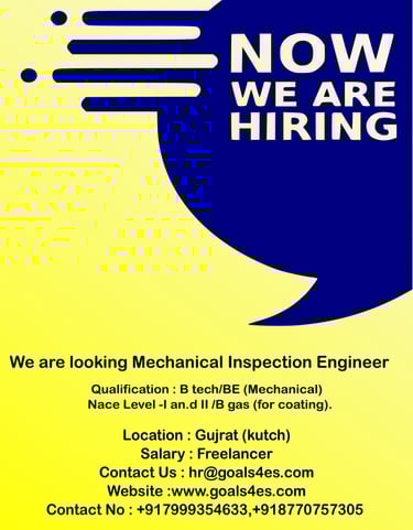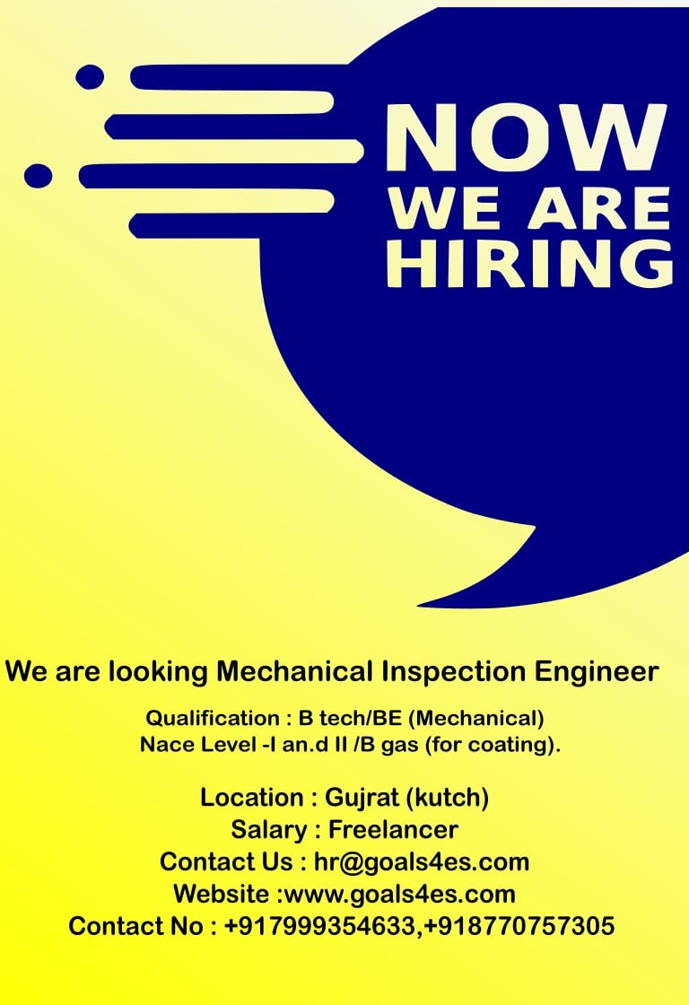 Qualification :B.Tech/BE (Mechanical), Nace level - I & II / B gas (for coating),CSWIP 3.1&3.2